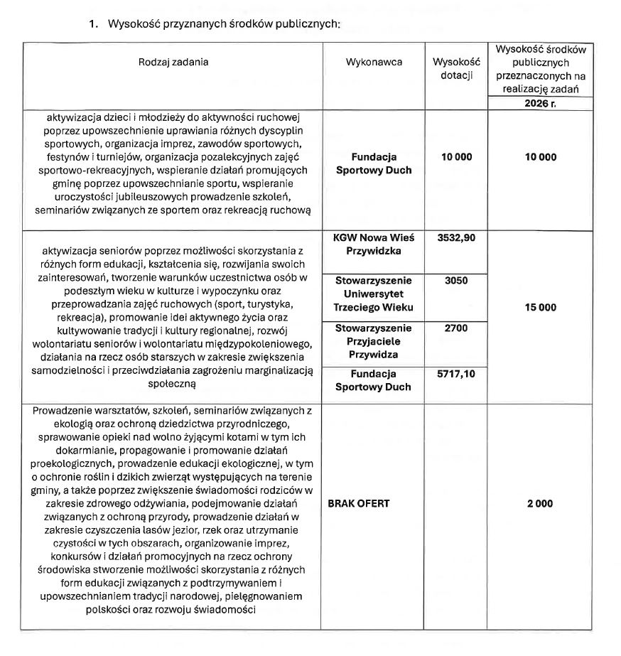 Informacja o rozstrzygnięciu otwartego konkursu ofert na realizację w 2026 roku zadań publicznych Gminy Przywidz.