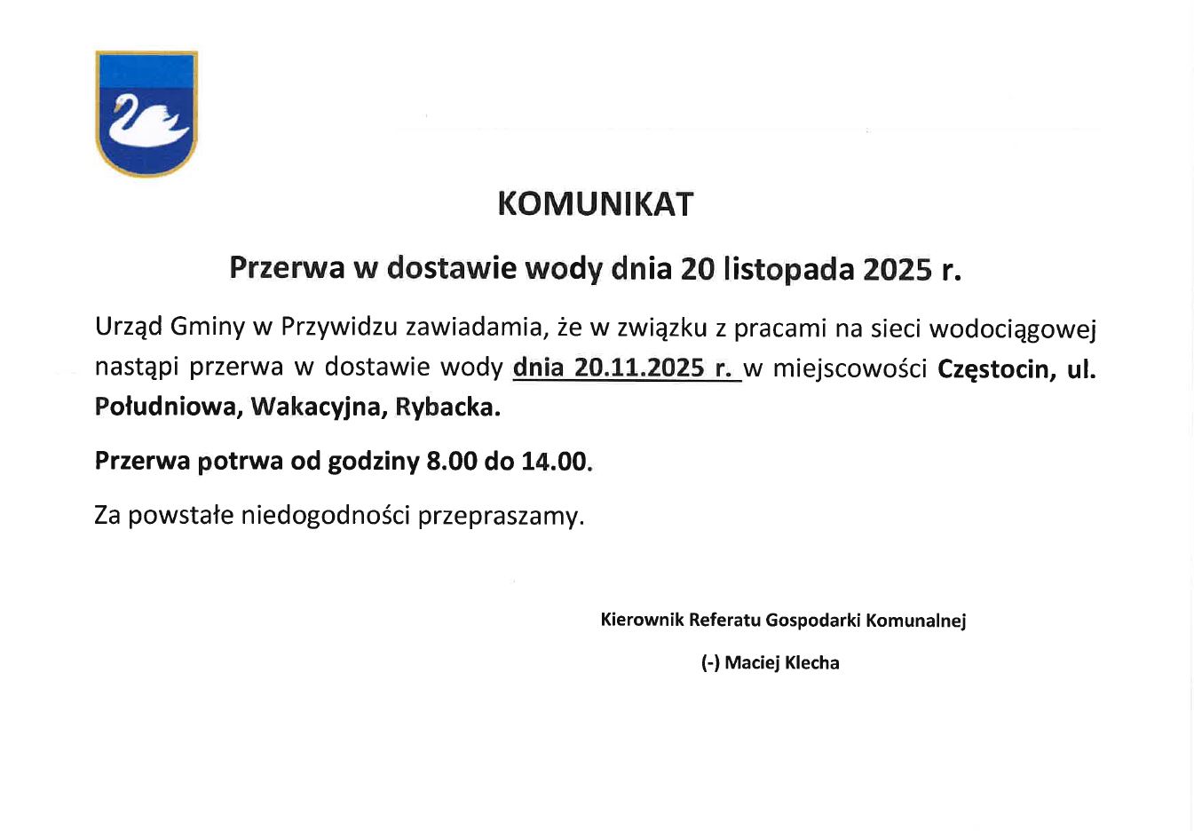 Komunikat Przerwa w dostawie wody w dniu 20.11.2025 w miejscowości Częstocin