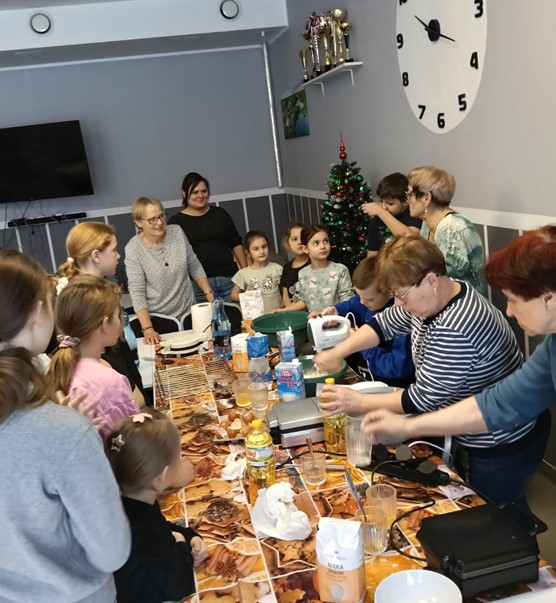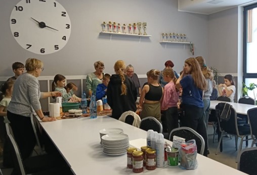 Warsztaty stały się nie tylko okazją do nauki podstaw kulinarnego rzemiosła, ale przede wszystkim pięknym przykładem integracji międzypokoleniowej. Dzieci z zaciekawieniem słuchały wskazówek seniorów, a seniorzy z radością obserwowali energię, kreatywność i zaangażowanie najmłodszych. Wspólne gotowanie sprzyjało rozmowom, śmiechowi i budowaniu relacji opartych na wzajemnym szacunku i życzliwości.